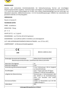 Arbeiten nach technischem Sicherheitsdatenblatt, der Gebrauchsanweisung, Normen und einschlägigen Arbeitsschutzbestimmungen ausführen. Technische Daten und Angaben zur Anwendung gelten für die Temperatur 25°C ± 2°C und für die relative Luftfeuchtigkeit von 55-60%. Bei Berührung mit den Augen sofort gründlich mit Wasser ausspülen und Arztkonsultieren. Der Produzent haftet nicht für Schäden als Folge anwendungstechnischer Fehler. Vor Gebrauch die speziellen Einsatzbedingungen aufmerksam durchlesen. Abfallschlüsselnr.: 150102 Kunststoffverpackungen. HINWEIS: Nur restentleerte und gesäuberte Gebinde zum Recycling geben! Bei Fragen lassen Sie sich bitte vom Hersteller beraten.