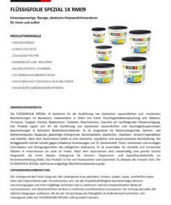 Die FLÜSSIGFOLIE SPEZIAL ist für die elastische, wasserabweisende und wasserdichte Abdichtung typischer Bauoberflächen an Orten mit hoher Wasser- und Feuchtigkeitseinwirkung bestimmt, wie z.B.: Balkone, Küchen, Bäder, Duschräume, Toiletten, Waschküchen, Keller vor der Verlegung von Keramik. Sie bildet eine dichte und elastische wasserdichte Beschichtung, die kleine Risse auf vertikalen und horizontalen Flächen überbrückt. Die Verbindung ist frostbeständig. Die fertiggestellte Schicht schützt gegen schädliche Einwirkungen von Öl, Schmierstoff, Pilzen, Schimmeln und sonstigen Chemikalien und Reinigungsmitteln des alltäglichen Gebrauchs. Es ist anwendbar für vertikale und horizontale Flächen in Innenräumen als auch im Freien. Das Produkt ist für Betonuntergründe, Zement- und Zementkalkputze, Gipsputze, Gipsblöcke, Zementplatten, Gipskartonplatten, Gipsfaser- und Zementfaserplatten, Estriche bestimmt. Nach dem Austrocknen wird zweckmäßig eine poröse Schicht hergestellt, die einen idealen Untergrund für Zement-, Dispersions- und Epoxidharzklebstoffe zur Keramikverkleidung bildet. Das Produkt ist frei von Koaleszenten und Lösemittel. Es belastet die Umwelt nicht. Die FLÜSSIGFOLIE SPEZIAL stellt keine endgültige Oberflächenbearbeitung dar.