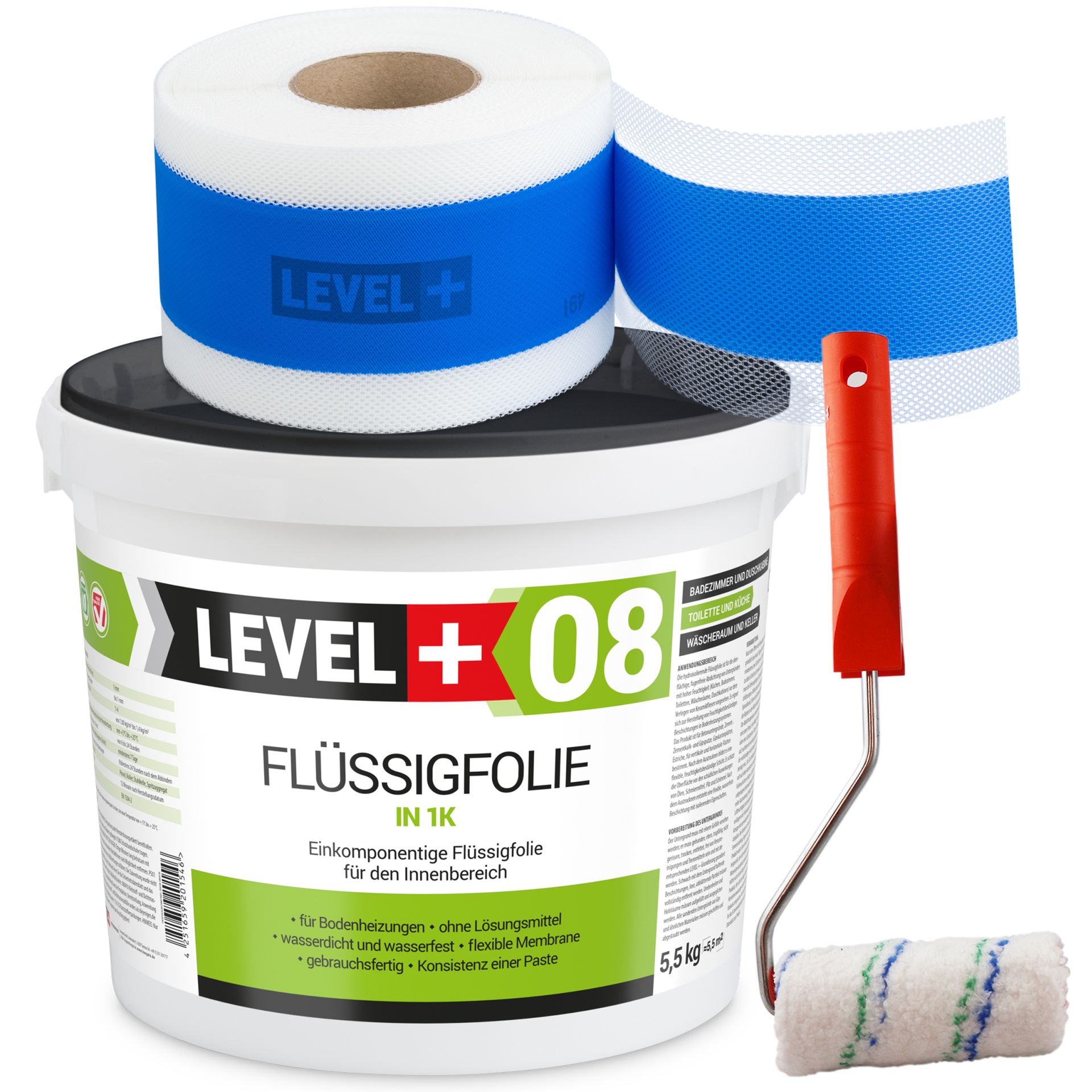 Dichtset Abdichtung Flüssigfolie 5,5kg Dichtband 5m Farbroller 10cm Dichtband LEVEL+ SET295