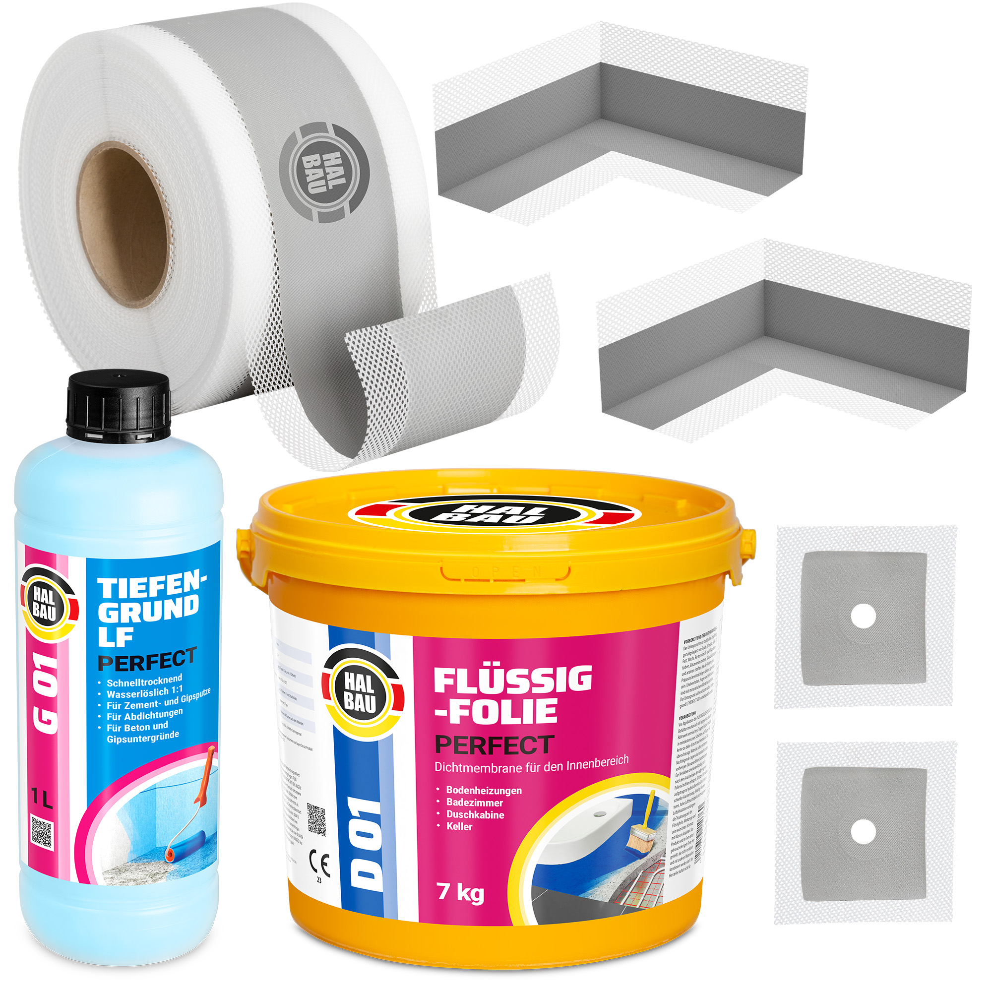 HALBAU Flüssigfolie PERFECT D01 ist eine flexible, wasserabweisende Beschichtung, die sich ideal für Badezimmer, Küchen und Waschräume eignet. Die Dichtmembran zeichnet sich durch einen hohen Widerstand gegen das Eindringen von Wasser aus. Hervorragender Schutz von Bauoberflächen gegen Öle, Fette, Säuren, Laugen, Schimmel und Pilze. Nach dem Trocknen bildet er eine flexible Beschichtung, die Spannungen und Verformungen des Untergrunds gut überträgt, nicht reißt oder abblättert und wasserfest ist. Das Produkt ist keine Endbeschichtung. Die Beschichtung bietet einen fertigen Untergrund für die Verlegung aller Ausbaumaterialien, d. h. Fliesen, Terrakotta, Holzfußböden usw. HALBAU Flüssigfolie PERFECT D01 wird auf Oberflächen aufgetragen, die feucht werden können, wie z. B. Badezimmer, Duschen, Küchen, und Wäschereien. Aufgrund seiner Eigenschaften empfiehlt es sich für den Einsatz im Innenbereich von Gebäuden als fugenlose Feuchtigkeitsschutz- und Abdichtungsschicht für Beton, Wände und andere bauliche mineralische Untergründe, z.B.: Kalkzementputz, Gipskartonplatten. HALBAU Flüssigfolie PERFECT D01 kann im Innenbereich in Räumen verwendet werden, die ständiger Feuchtigkeit ausgesetzt sind, wie z.B. Waschküchen, Bäder, Duschen, Saunen. Sie ist auch als Abdichtung für einen linearen Abfluss in einer Duschkabine wirksam.