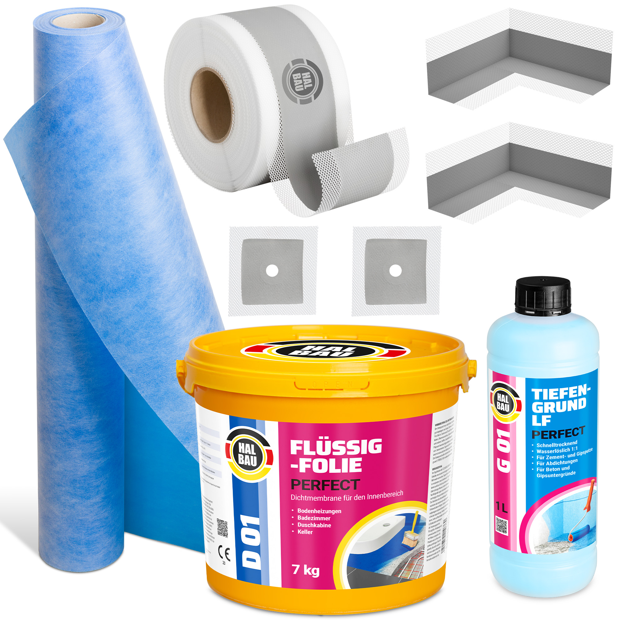 HALBAU Flüssigfolie PERFECT D01 ist eine flexible, wasserabweisende Beschichtung, die sich ideal für Badezimmer, Küchen und Waschräume eignet. Die Dichtmembran zeichnet sich durch einen hohen Widerstand gegen das Eindringen von Wasser aus. Hervorragender Schutz von Bauoberflächen gegen Öle, Fette, Säuren, Laugen, Schimmel und Pilze. Nach dem Trocknen bildet er eine flexible Beschichtung, die Spannungen und Verformungen des Untergrunds gut überträgt, nicht reißt oder abblättert und wasserfest ist. Das Produkt ist keine Endbeschichtung. Die Beschichtung bietet einen fertigen Untergrund für die Verlegung aller Ausbaumaterialien, d. h. Fliesen, Terrakotta, Holzfußböden usw. HALBAU Flüssigfolie PERFECT D01 wird auf Oberflächen aufgetragen, die feucht werden können, wie z. B. Badezimmer, Duschen, Küchen, und Wäschereien. Aufgrund seiner Eigenschaften empfiehlt es sich für den Einsatz im Innenbereich von Gebäuden als fugenlose Feuchtigkeitsschutz- und Abdichtungsschicht für Beton, Wände und andere bauliche mineralische Untergründe, z.B.: Kalkzementputz, Gipskartonplatten. HALBAU Flüssigfolie PERFECT D01 kann im Innenbereich in Räumen verwendet werden, die ständiger Feuchtigkeit ausgesetzt sind, wie z.B. Waschküchen, Bäder, Duschen, Saunen. Sie ist auch als Abdichtung für einen linearen Abfluss in einer Duschkabine wirksam.