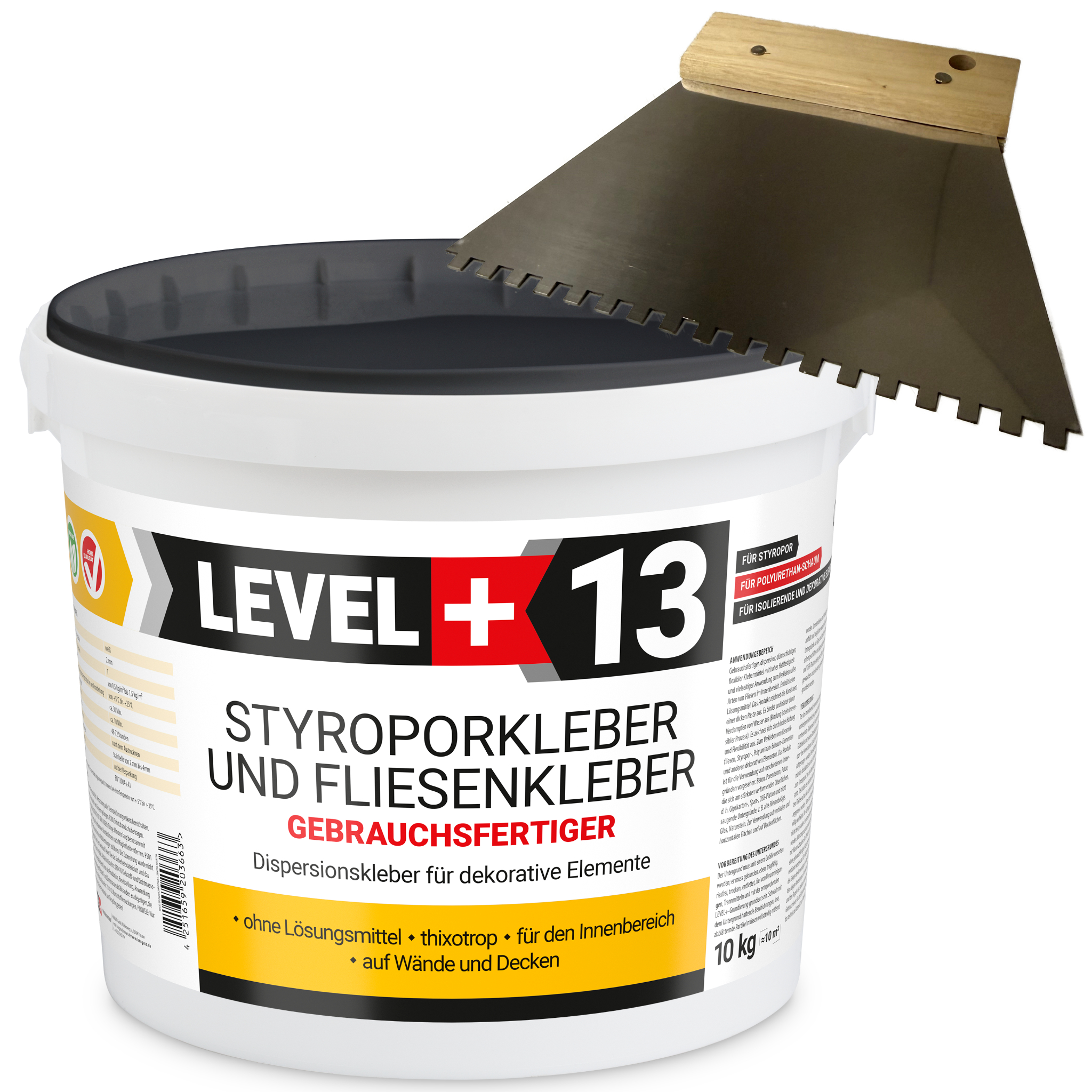 Styroporkleber Dispersionkleber Korkkleber 10kg Polymerbasis + Zahnspachtel 4mm SET LEVEL+13